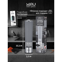 Электрическая мельница для специй MIRU VELOR KA037 станет незаменимым помощник для каждой хозяйки. Она способна с высокой эффективностью перемалывать соль, перец или набор специй. Для работы устройства необходимо вставить 4хAA батарейки (в комплект не входят), наполнить колбу специями и нажать кнопку включения. Устройство перемелет необходимое количество пряностей. Принцип работы основан на взаимодействии двух керамических жерновов, представляющих собой два круга, один из которых закреплён неподвижно, а другой под воздействием электричества приходит в движение, перемалывая специи. Керамика ценна тем, что она никак не влияет на вкус специй, в отличие от других материалов, способных оставить лёгкий привкус. Особенности: - Керамические жернова. - Регулировка тонкости помола. - Объём 75 мл. - LED-подсветка. - Воронка для удобного наполнения контейнера специями. -Крышка защита от просыпания. - Питание от 4хAA батареек (в комплект не входит).- Удобная кнопка включения.
